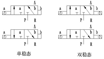 閥體兩端各有一個控制腔,兩個控制腔各有一個Φ2mm的先導孔與氣源壓力口(接口“P” )相通,氣源氣由先導閥來控制進入控制腔(接口“A” )。當一端線圈通電,磁力作用打開先導閥,氣源氣進入該端控制腔(接口“A” ),推動活塞帶動閥芯,改變工作狀態(tài)。閥體有單穩(wěn)態(tài)和雙穩(wěn)態(tài)兩種,單穩(wěn)態(tài)閥線圈只有長期通電,電磁閥才能保持狀態(tài),一旦掉電,馬上復位。雙穩(wěn)態(tài)閥一旦線圈通電,閥位狀態(tài)改變后,即使掉電,仍保持現(xiàn)狀不變,只有當一端線圈通電時,閥位才會發(fā)生變化。